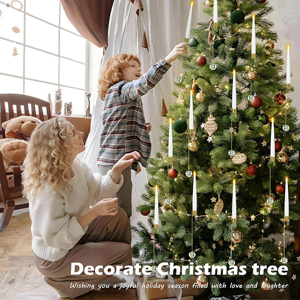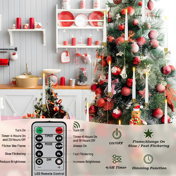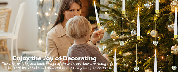 🎁WHAT YOU GET: 6 Pcs LED Candles/12 Pcs LED Candles powered by 1 AAA battery(not include), 6/12-pack of 7" clear crystal ball hooks, one 10-key remote control. Use these unique Christmas tree decorations to make your Christmas tree stand out among the rest and turn your home into the envy of your neighbors!